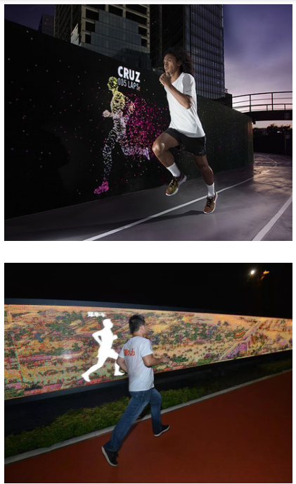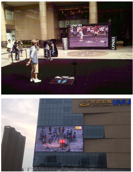 影随我动-当体验者站在大屏幕前时,体感摄像头会将捕捉到的人体影像以实时剪影的形式叠加呈现在大屏幕中,人影当中会呈现另外一层展示的内容,可以是活动主办方的品牌文化、或者大会信息,可根据广告商实际需求自定义更换场景内背景视频及前景广告文字。